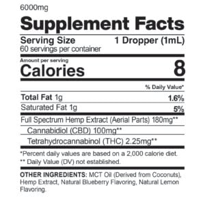 - Available in 30mL (1500 mg CBD + 67.5 mg THC), 30mL (3000 mg CBD + 67.5 mg THC), and 60mL (6000 mg CBD + 135 mg THC) sizes